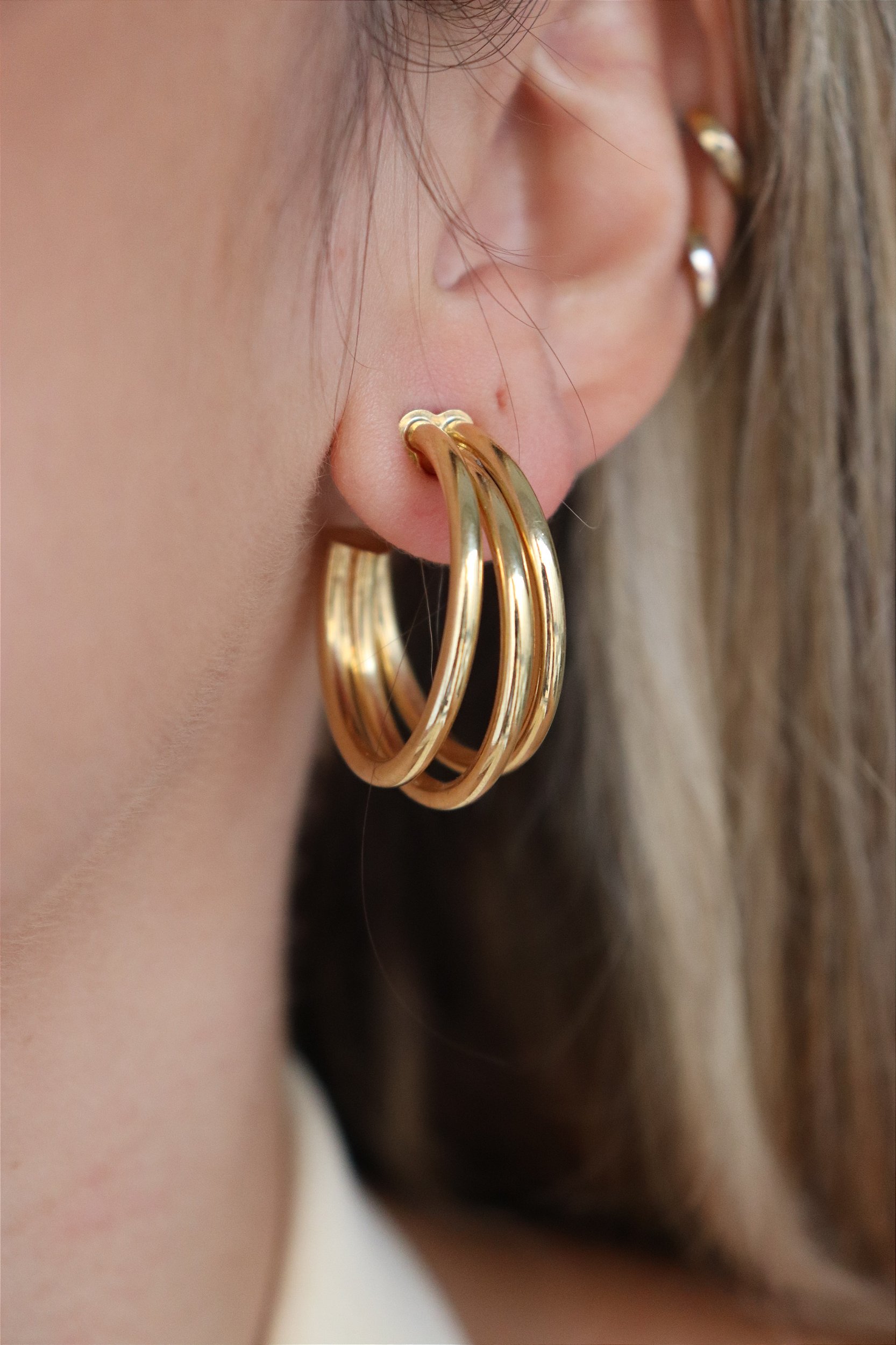 rinco de argola tripla dourada em semijoia, com design moderno e acabamento polido que garante brilho intenso. Modelo leve, versátil e sofisticado, ideal para compor desde produções casuais até looks mais elegantes. Peça hipoalergênica com banho de alta durabilidade, perfeita para quem busca estilo e conforto no dia a dia.