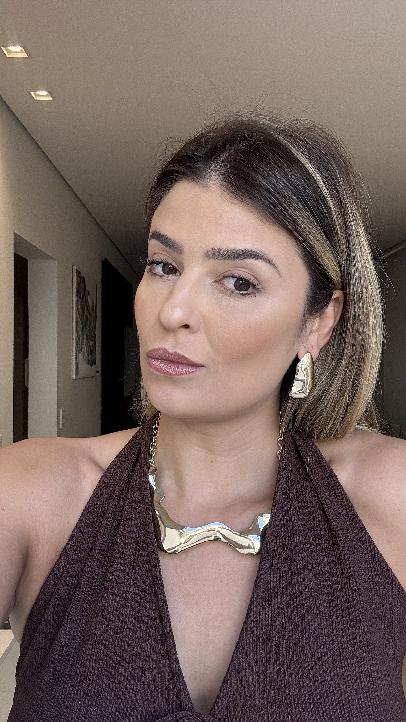 O colar em banho de ouro 18k apresenta formas orgânicas e fluidas, com acabamento polido de alto brilho que reflete a luz de maneira única, destacando qualquer produção. A modelagem anatômica garante conforto e elegância, ideal para ser usado como peça de impacto.