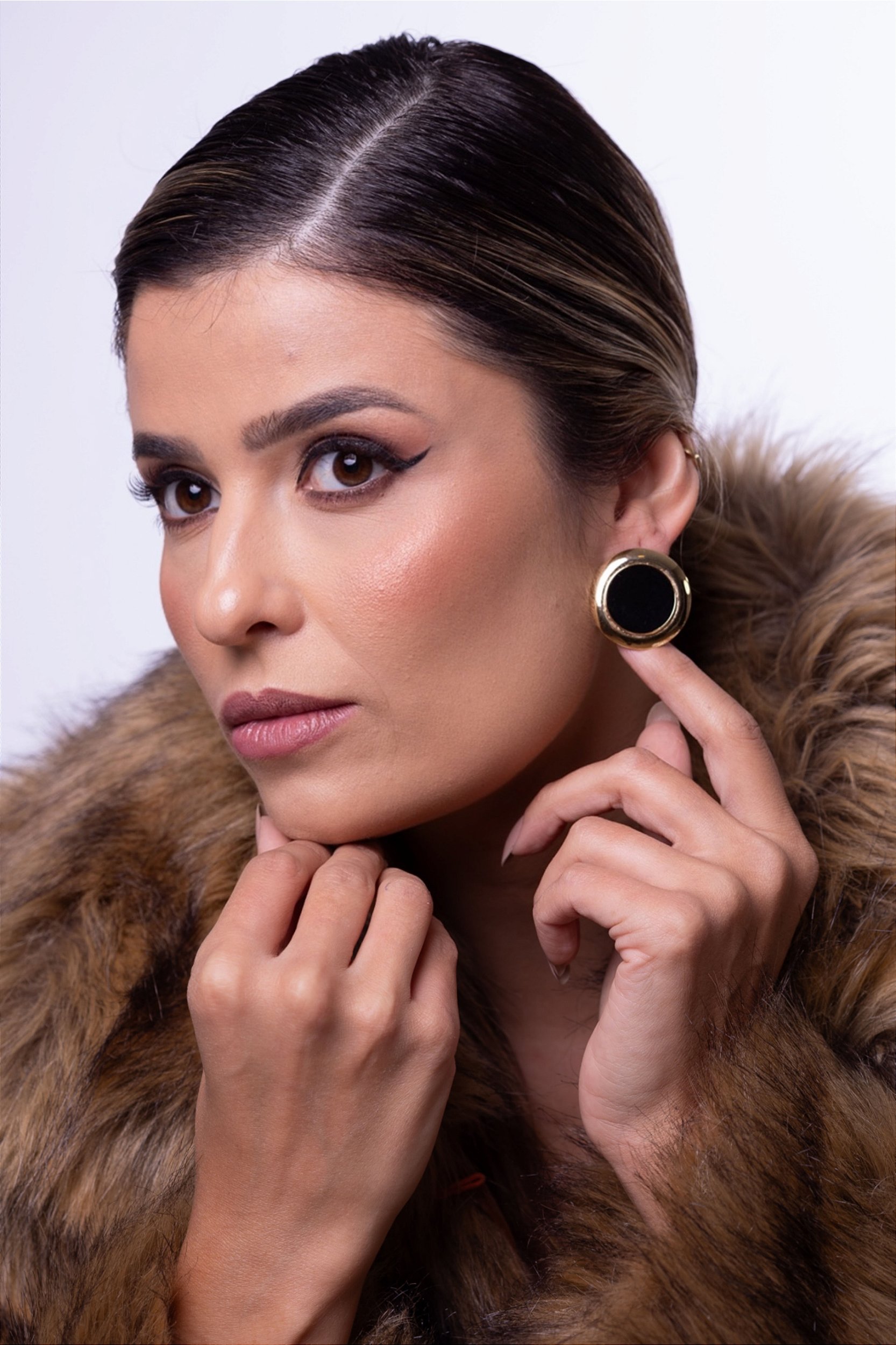 Brinco estilo botão com base metálica redonda e banho de ouro 18K. Centro em resina preta de acabamento liso e brilho intenso, criando um contraste elegante e atemporal. Design minimalista, ideal para composições clássicas e sofisticadas.