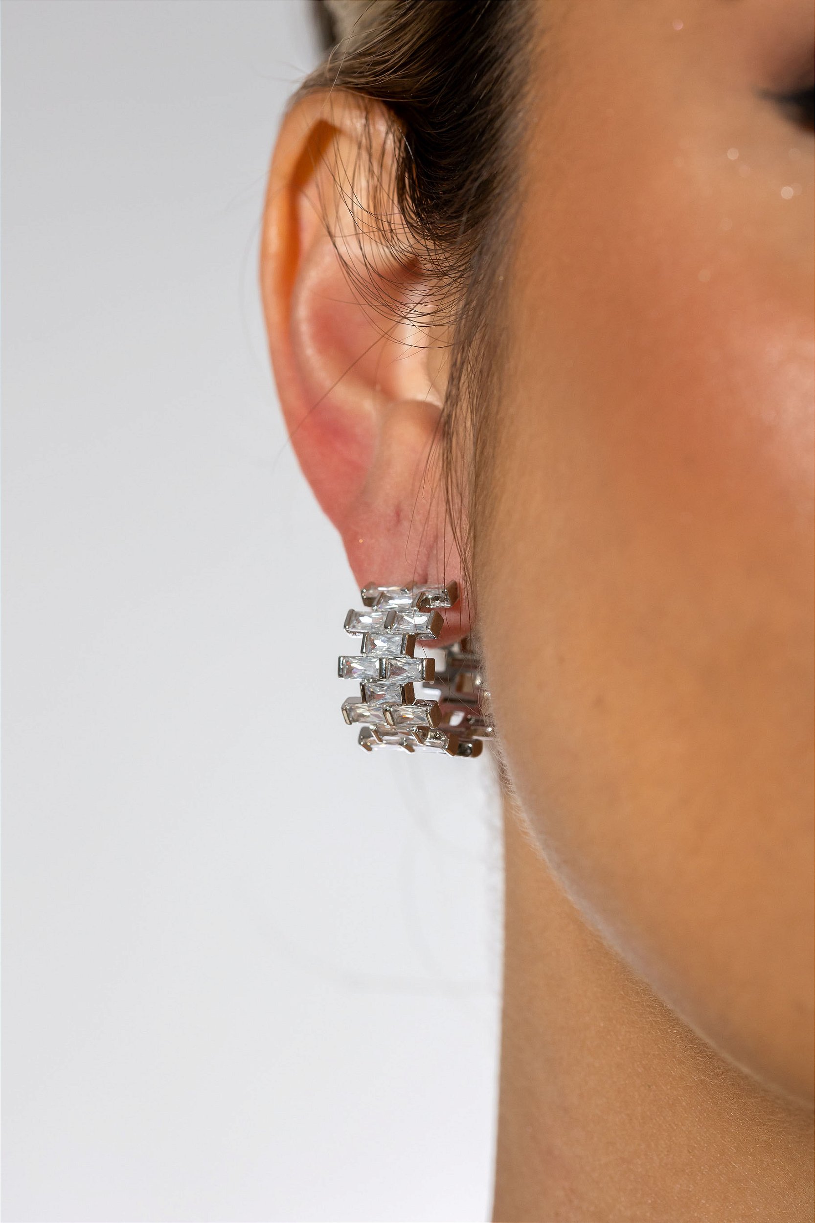O brinco perfeito para elevar qualquer look com elegância. Este brinco possui banho em ródio de alta qualidade, garantindo brilho intenso e maior durabilidade. Seu design moderno em trama com zircônias lapidadas proporciona um visual sofisticado e impactante, ideal para quem ama acessórios que se destacam.