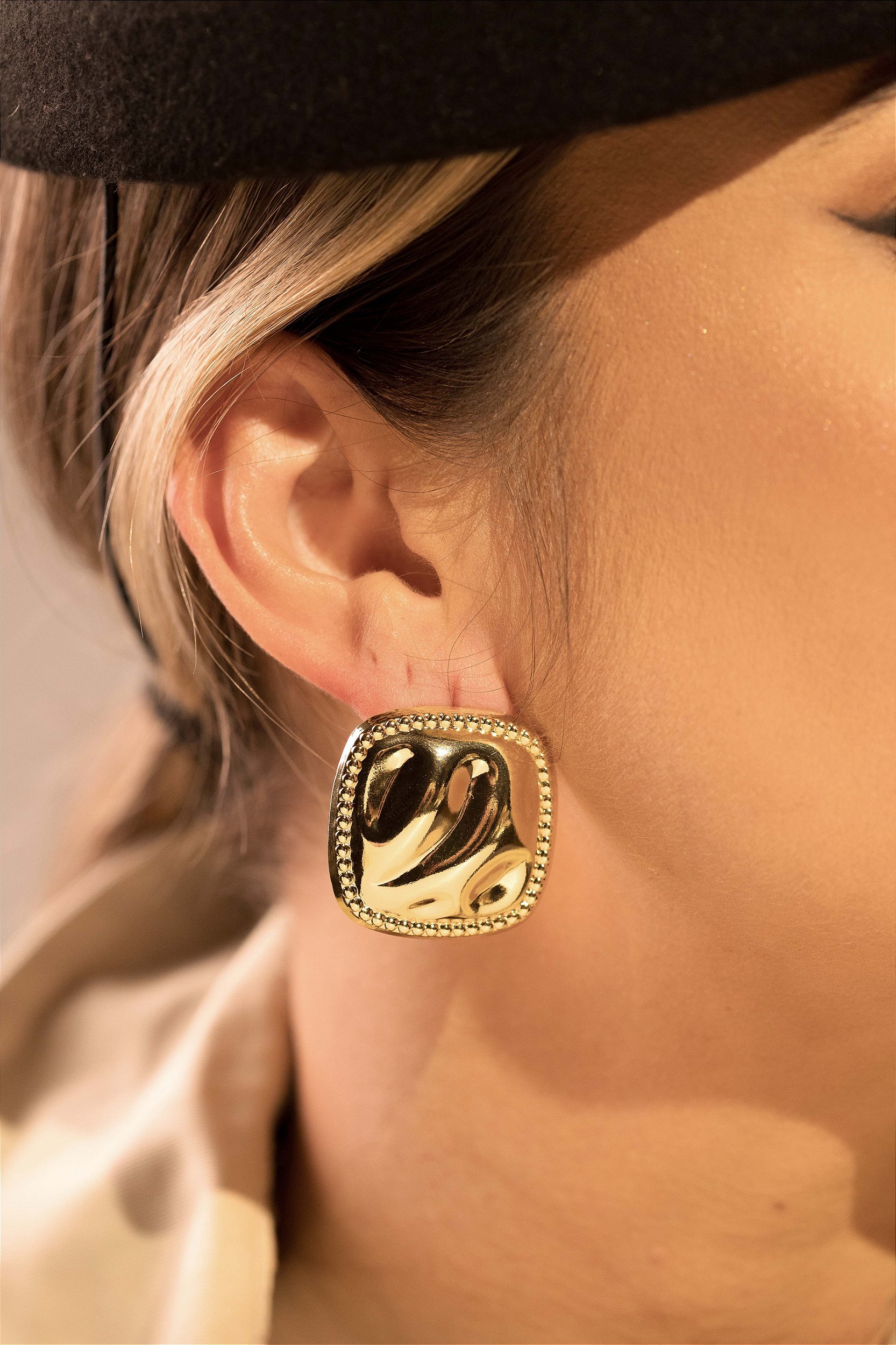 O brinco é confeccionado em metal com banho em ouro 18k, destacando-se pelo design quadrado e pelos detalhes na borda que conferem charme e sofisticação. Seu tamanho e estilo fazem dele uma peça ideal para uso no dia a dia ou em ocasiões especiais, combinando com diversos visuais.
