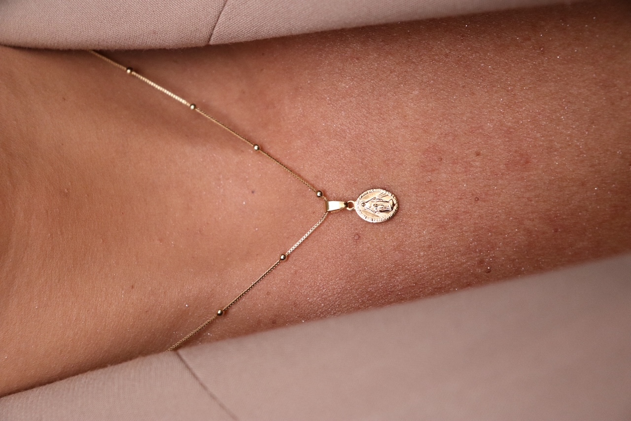 Um colar delicado, com 40cm de corrente com detalhes em bolinhas.