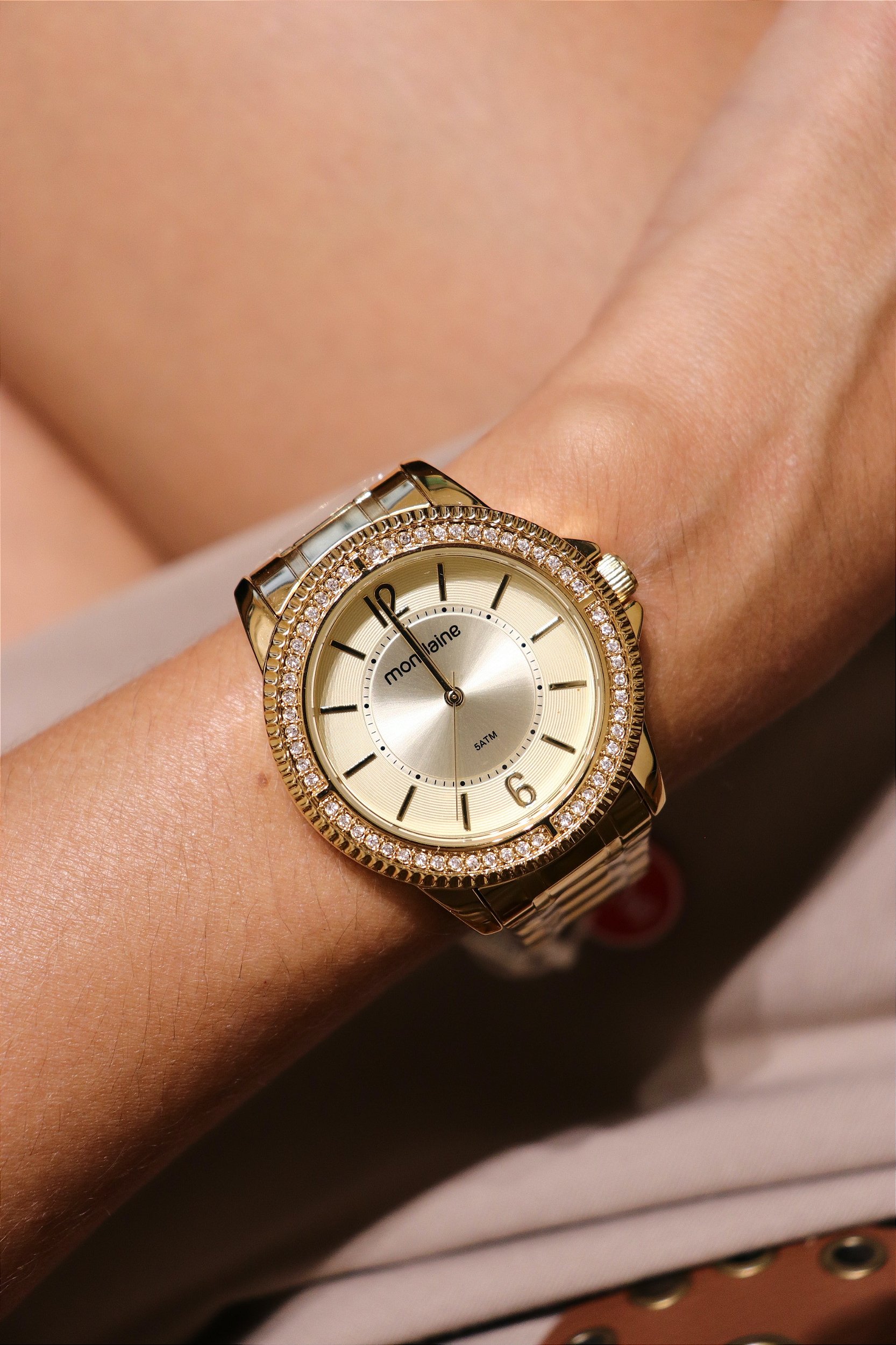 Relógio com caixa de metal redondada, aplicação de cristais em sua catraca, visor na cor champagne com ponteiros e marcadores dourados. Possui pulseira em aço dourado com fecho por trava de pressão, dispensando o uso da força. Peça ideal para usar durante a noite e em ocasiões especiais. Esse relógio possui a caixa em 4 cm de tamanho.