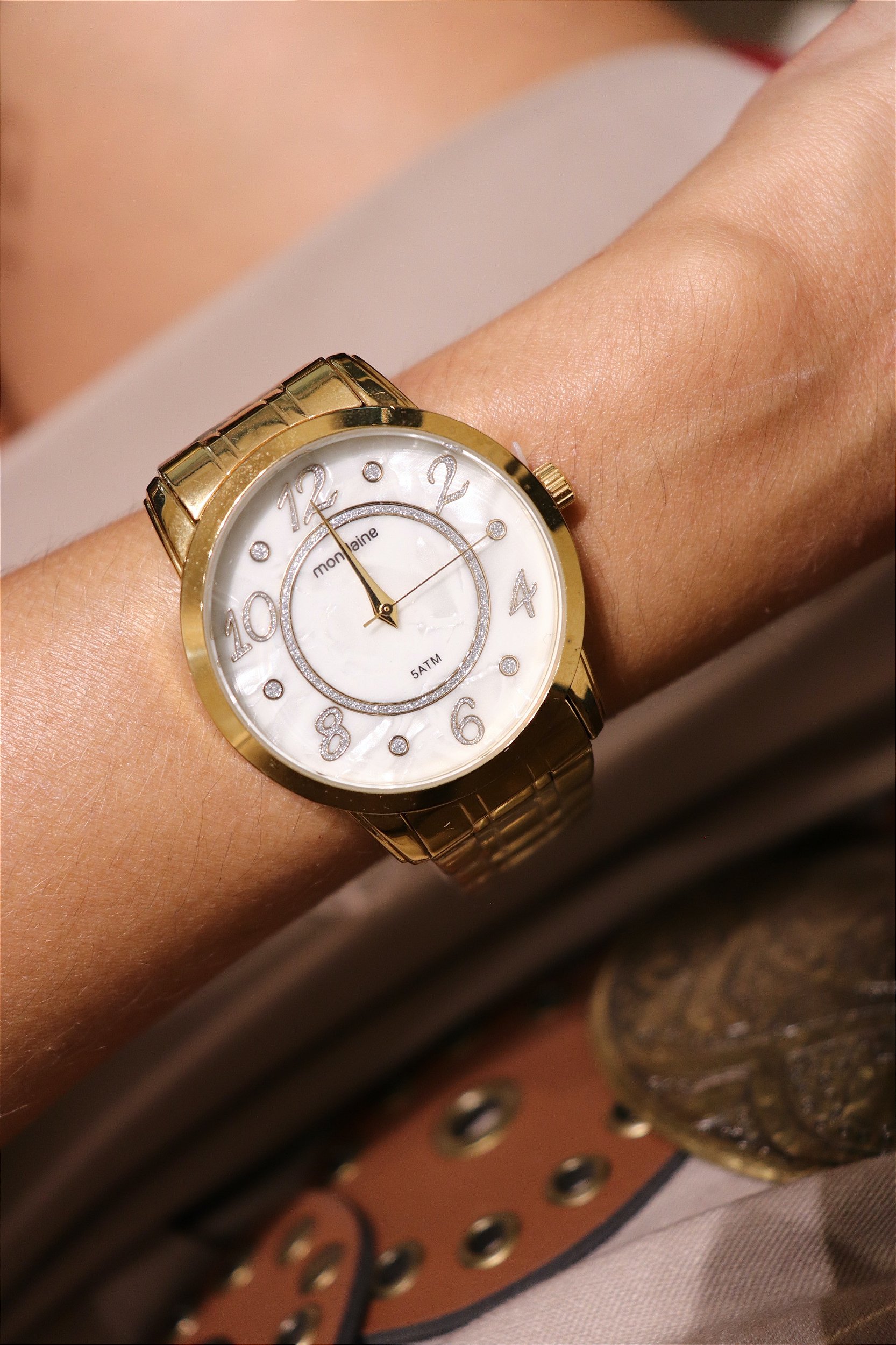 Possui mecanismo Analógico, a pulseira é na cor Dourado, fabricada em Aço, com 23 cm de comprimento e possui Fecho Dobrável com Dois Botões. A Caixa (peça onde fica o mostrador) é fabricada em Metal, possui fundo do tipo Rosqueada, mede 4,0 cm de diâmetro, sem considerar a coroa, e 0,9 cm de espessura, o que é considerado tamanho Grande para relógios do gênero Feminino. O Relógio tem nível de resistência à água especificado em 5 ATM. Tem Garantia de 1 Ano com o Fornecedor.